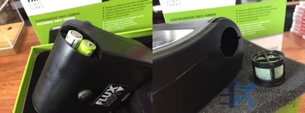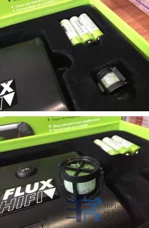 先看一下盒中内还有什么东西,产品由专门的硬纸格子盒装着,左边的就是Vinyl Turbo ,右边则放置三颗AA 电池以及用于Vinyl Turbo 的过滤芯。先看看Vinyl Turbo ,与Flux-HiFi 的另一产品Sonic 的作风一样,机身采用全黑设计,形状上大致呈一个正方形。
