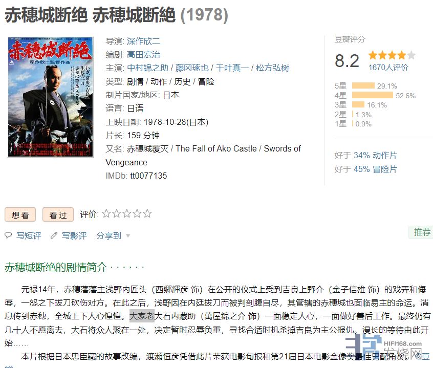 今晚看的上世纪70年代日本影片《赤穗城断绝》,讲的是幕府时期的武士阶层,在大家老的带领下为受冤切腹的主公复仇的故事,接近2小时50分钟,前面2/3时间就是讲述为复仇而隐忍,内心的各种挣扎。此片服装、道具及布景等,都很用心。看到片中至今都在席地而坐的日本人,以及一些习俗与用具,其实都与宋代以前的中国,有着深厚的渊源。我们的传统,现在早就丢失了,而在邻里的日本,作为活化石反而被保留了。。。幕府时期的武士,核心教义就是:仁与忠,片尾主公的家臣大家老,在46个忠心的武士相继切腹后,自己也切腹自尽,这个菊花与刀的民族,对死亡有非常独特的哲学,很感慨。。。最后顺便查了下度娘,关于片中大家老一职的解释:家老,是日本江户时期幕府或藩中的职位,家老一般有数人,采取合议制管理幕府和领地的政治、经济和军事活动,在幕府或藩中地位很高仅次于幕府将军和藩主。