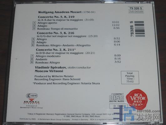 119.莫扎特三首小提琴协奏曲,斯皮凡科夫与莫斯科名家合奏团演奏,俱乐部版,德国SONOPRESS无码,从内圈刻码看是原来正价盘RD60152,基本OK 50元