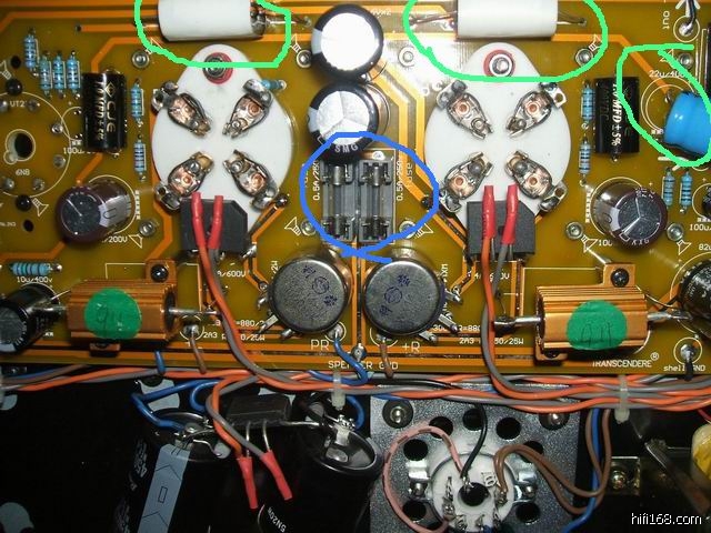 图中绿色圈为蔡博士摩改,第一级的电解也换成飞利浦47u450V,整体听感和V1用了6F8G相同,高频泛音丰富,中频通透!高人就是高人!