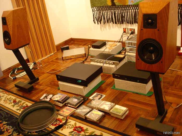 分享音乐魅力之迷人世界!----赴佛山顺德容桂聆听乐林盟主、驾势B&W、贵丰美歌的快乐之旅!一年之气在于春,春末,大地万物正蓬勃生长....昨天,趁着周末休息,这正是烧友聚会交流磋切的好时光,天本来还下着大雨而嘎然放晴,这真是得益于老天相助也,使我等顺德行之得以成功,外面温度20度C,雨过天晴气潇条,算不冷不热正适宜.乐林8t,LINN12少,QUANLONG老大三位一齐,抽拾行装,劲头十足,这可是一次较为疯狂的行程!为什么这么说呢?哈哈!这是因为我带着一大圈"喊菜",QUANLONG老大带上手提电脑测试分析仪,准备捣苦测量顺德众友的听音环境混响时间和频率波形状况,这也是得到顺德容桂杨先生早前相约而备吧,江门市距离佛山顺德容桂区约60公里,所以我们早早安排好行程时间,确定下午两点出发,QUANLONG老大驾车,保持高速前进,一路上兴致勃勃,大约行程一小时正,我们已进入容桂这片发烧热土,直奔约定的地点,早早见到杨兄驾车恭候于此.第一站首先到杨兄(YMZ1688)那聆听乐林推盟主,一进杨兄家的独立听音室,我见到了乐林加盟主如下: