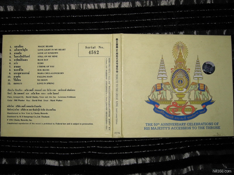 见图,很好听的一张爵士音乐。里面的好几首曲子都是泰国国王亲自作曲的,很佩服!是限量版的,在chesky官网也没有查到。请知道的朋友帮忙告诉一下,谢谢!
