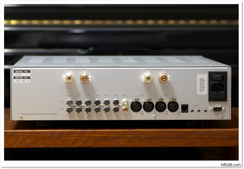 反映音乐个性全新登场的谱丽声Thor Mk II为合并式放大器之最优秀设计机种,是专为喜欢纯两声道的音乐爱好人仕而设,其简洁及精美造工,充分反映出Bladelius独特的音乐个性及精炼完美的技术设计。当把放大器从包装纸箱取出时,机箱体积看似不算太大,但拿上手的感觉是异常沉重,笔者便立即自行磅秤,发觉重量竟然达到23公斤(注:厂方并没有提供本机重量的资料),实属罕有。骤眼看Thor Mk II的机身外型,样貌雍容华贵,尽显瑞典的认真严谨而带有点保守兼优雅的传统风格。全机金工是经过精巧的手工艺技术和细致的打磨处理,整体箱边均是圆滑无角设计;机身的顶部、底部及左右两侧板都设置有很多散热气孔,完全是刻意利用上下左右的空气对流以增强散热功能,令降温速度更加快捷稳定。