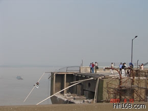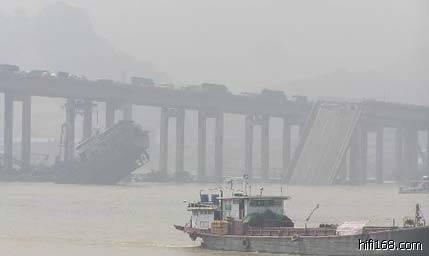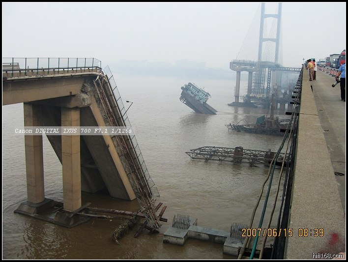 广州日报大洋网记者一早赶赴到事故现场,大洋网记者在第一时间连线前方记者。据记者了解,九江大桥南桥段有近100米的桥面垮塌,坍塌的桥体呈45度插入水中。抢险部门表示,事故怀疑遭一艘运砂船撞击桥墩引起的,目前船体正倾斜插在水中,露出部分船尾。