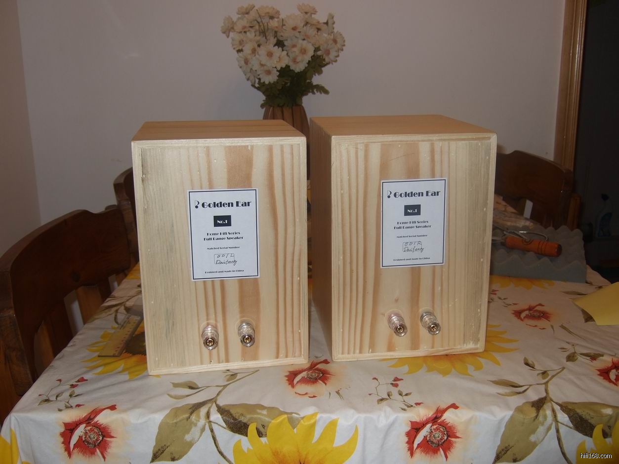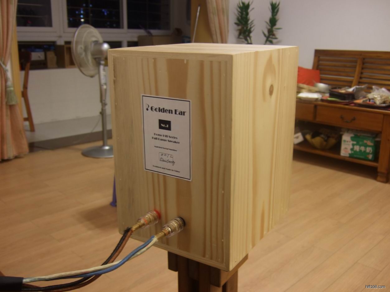 箱体用进口白松木制作,声音更鲜活,板边45度角对接,磨圆,前面开槽,安装内嵌式音箱罩,网布紧贴前面板,减少声音反射,超重纯铜渡24K金接线柱(10块一个的),箱体表面打磨光滑,七便喷漆,10颗内六角钢螺丝固定前面板,专门为他设计定做的纯铜拉丝标牌
