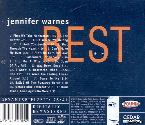 称得上全球最好听的女声,奥斯卡最佳歌曲奖得奖者—"珍妮花-华恩丝"...磁性、充沛、靓绝的歌喉.Zounds老板将Jennifer Warnes最发烧畅销的专辑(包含「蓝色雨衣Famous Blue Raincoat」、「猎人」)重新混音重刻,再精挑细选出17首音效和曲目都是发烧和动听的制成这张超级精选集。除了喜欢她的发烧友可以一次听得过瘾之外,本片绝对是最强的女声大碟。一句话,疯了...「她的嗓音就像加州的天气,充满了阳光,但背后却又隐藏着这地震般强大的能量」。这是伦"纳德·科恩"给"珍妮花·华恩丝"最与众不同的赞美,同时也十分真切地道出了多才多艺的"珍妮花·华恩丝"之所以被美国乐坛公认为最伟大的女性艺人的原因所在!