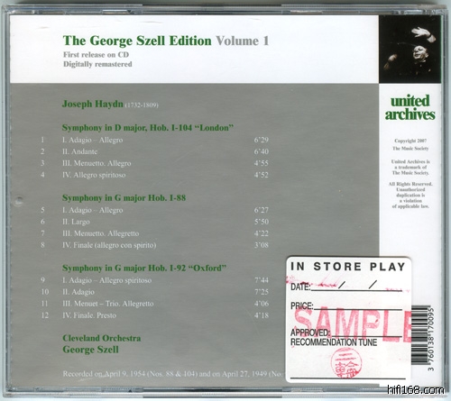 Vol.1:Szell的Haydn是拿手曲目,他的Haydn有着接近老贝的烈度。这里的MONO NO.92“牛津”录音于1949年4月27日(另外一个立体声的录于1961年),属哥伦比亚,1950年2月同时以LP和SP的形式发行。NO.88和NO.104“伦敦”则是最早在Epic的录音,时间是1954年4月9日,1956年2月才发行,倒霉的是那时Epic居然还没用上立体声系统(同样XXX的还有EMI)!