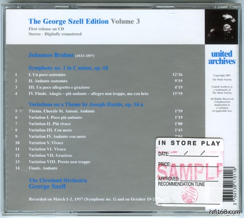 Vol.3:本唱片上的Brahms Haydn主题变奏,是Cleveland的第一个立体声录音,时间是1955年10月19-21,自然不是在东家Epic的录音咯,这是在Book-of-the-Month Club的录音,因为跟Epic合约的关系,乐队当时叫The Music Appreciation Symphony Orchestra(这种名堂当时很普遍,旧文也有提过了)。与此对照的是,Epic到1957年终于决心用立体声系统,2月22-23日Szell带领Cleveland首先录下了老贝的“英雄”,3月1-2日录下了本唱片上的Brahms NO.1,这个幸运地得以立体声发行LP。Epic显然冥顽不化,Szell其后录下的许多录音居然开始没有发行立体声版,其中有的直到Szell转约哥伦比亚才发行立体声,甚至有的最近才发行(还是居于Sony宣称Szell的部分母带“神秘消失”)!