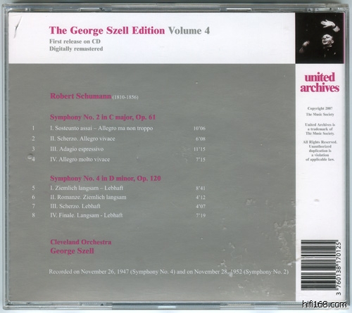 Szell跟Cleveland的第一批录音在1947年4月21-23日,曲目全部是之前在音乐会中演出的,这也是Szell一个非常显著的特点,录音前的曲子都要先在音乐会中事先演出。United archives的这四张Szell的录音是第一批发行的,全部标示“初CD化”,都是Szell较早跟Cleveland以及纽约爱乐的录音,录音集中在美国哥伦比亚和Epic。
