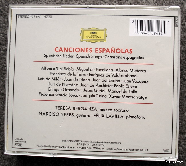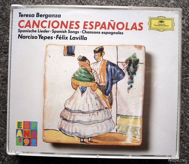 下面开始歌曲部分。先来一张冷门的:贝尔甘扎演唱西班牙歌曲,2CD。第一张是吉他伴奏,由耶佩斯担任;第二张是钢琴伴奏,由歌唱家的前夫Felix Lavilla担任。请注意封面左下角有一个“西班牙92”的标识,似乎表明是92年奥运会时推出的,借以彰显民族性格。