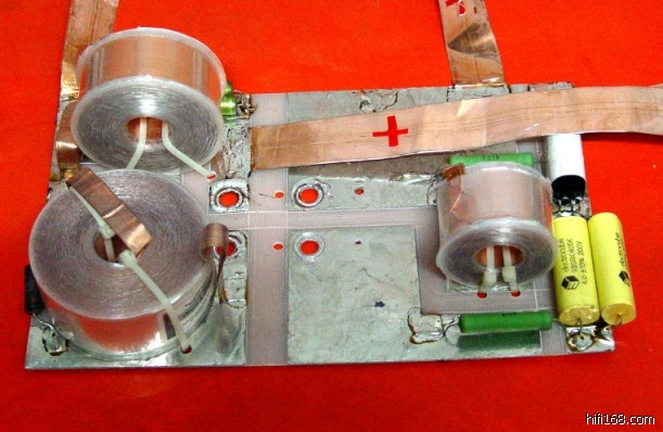 这里大胆将分频点选在300Hz左右,实际计算为305Hz。一定要分低一点才有好效果啊,一定不能悭钱。查表知L=7.77mH,C=60.709uF。L大得恐怖,几乎没有厂家肯加工,这里为了减少直流电阻,用1.5mm的漆包线做磁芯电感。C由美国EC50uF电容与REL-CAP12uF电容并联(实测数值=60.7uF)。由于工作在较低的频率里,低通分频不设阻抗补偿,如设,可由30uF电容与8欧电阻串联而成。