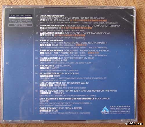 这是由黑胶大厂 Classic Records 负责全程制作,选录了 12 首最畅销黑胶唱片的精 华,內容以古典及爵士为主。每一首曲子都是选自发烧友梦寐以求演录俱佳的经典专辑。其中有一大半是不曾发行过 CD,或者是曾经发行过,但早已绝版的 CD。对于许许多多不曾踏入 LP 世界的乐友來说,这些专辑永远都是心中时时牵挂的遗憾。例如最著名的「皇家芭蕾」,Classic Records当年发行过一次 CD 以后,就不曾再版,致使现在只能够花冤枉钱卖「盜版品」來解渴了。