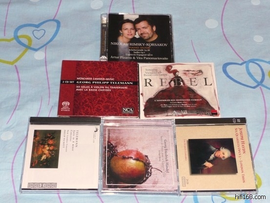 瑞贝尔(Rebel)的唱片似乎不多见,我个人之前只收过他和泰勒曼、格鲁克的一张合集,曲目应该是《元素》吧。中间排右侧的这张唱片收录的是他的小提琴与低音通奏的奏鸣曲,总计六首,不是很常见的;瑞贝尔的作品及相关录音似乎不多见的。最下面中间的那套唱片收录的是亨德尔的《键盘组曲》,一至八号,两张套的;原来收的同类曲目的唱片都是用钢琴演绎的,一直想着要收一套键琴版的《键盘组曲》,这套唱片也算是让我夙愿得了偿。余下的两套唱片收录的是泰勒曼的作品;紫红色封面的那套共两张,收录了六首小提琴奏鸣曲和六首长笛奏鸣曲;慕尼黑室内乐团演奏的,其中演奏大键琴的是录制过海顿钢琴奏鸣曲全集的女键盘演奏家Christine Schornsheim;算是“老相识”了。琴鸟的这张唱片收录的是泰勒曼的长笛组曲及长笛协奏曲,上个世纪八十年代的录音;Philip Pickett与新伦敦合奏团录制的,一个非常迷人的演绎。