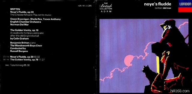 诺亚方舟是我最喜爱的试音碟,它虽然是写给孩子们演出的,但上帝、诺亚,诺亚之妻由专业歌手担任,而一个弦乐四重奏(小、中、大、倍低音大提琴),双钢琴、木笛、打击乐器及管风琴均由专业乐手担任(从高文花园皇家歌剧院及英国室内管弦乐乐团中抽调人手)。其余诺亚的三个孩子及其妻子们、动物、邻居、号角队及其它乐器均由孩子们担任,另外还有一队儿童合唱团。这编制规模也不算小了。时间是