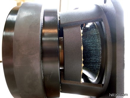 高音单体竟然用上了Dynaudio镇厂之宝 — Esotec单体。这只单体象征的是丝振膜软半球的最成熟杰作,等级甚至比我的Sonus Faber Minima Amator喇叭所用的Dynaudio高音单体还高。看到这纯洁无暇的丝质振膜,以及厚实的全铝合金单体障板,相信每个发烧友都会垂涎三尺吧。