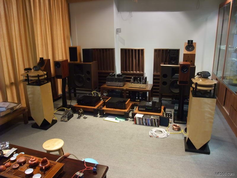 店中使用的前级和唱放都是MENN的产品,唱盘是先锋的皮带盘加德国的Souther直线臂加高度风1K多的MC唱头,这么便宜的唱头出来这么有质素的效果实在让我大感意外。仔细研究下发现这个先锋的唱盘的木质底座和那几个铝合金高脚原来专门定做的,最特别的是安放唱盘的几个轻质水泥砖块,据说是MENN在附近工地上拿一包香烟从民工的手里换回来的,现在那些民工碰到MENN都会问他:“还要不要砖头啊?”