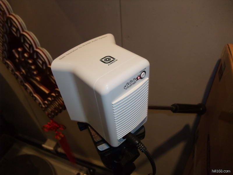 琴鸟音响的店主姓林,出于对黑胶的熟悉和热爱,自行研制和开发了许多的黑胶附件,包括洗碟机、洗碟水、唱针水、唱片扫、测速器、针压计等,应有尽有,在我到店的当天,刚好看见林老板拿着一个类似音箱的物体向着唱盘吹,一问之下,原来这是一个专门用来除静电的仪器,不但可以除LP上的静电,唱盘、唱针、CD片等都可以使用,只要把这个“音箱”对着目标吹就可以,十分方便。