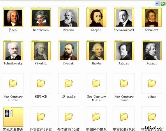 一个文件夹一张唱片, 文件夹的自定义图标就是CD的封面, 然后按作曲家,音乐类型分类.