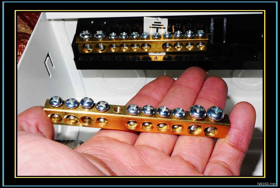 关和4组开关以及容纳口径较大的电源线。此外,这个电箱还内置了纯铜镀铑白金接线柱,