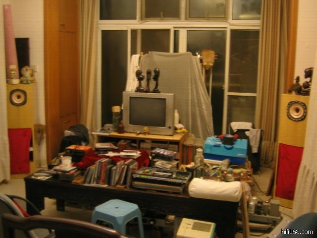 他的现役设备是一对北京老周做的音箱,是一对使用钢琴云杉夹板为箱体的Lowther PM6A音箱,一对WE(西电) 124B后级,一对马兰仕9后级(听说花了14万RMB买的),一对德律风根老调音台上的前级放大器,一部麦拿伦AV处理器当前级兼解码器用,还有一台LINN的LP 12,最后是一台名不见经传的国产"BBG" DVD(约7,8百块钱吧?!),而且机上盖已被拆除,尤如一部被老余凌虐已久的模样,就像被脱光衣服的爱妾(转盘)般.......