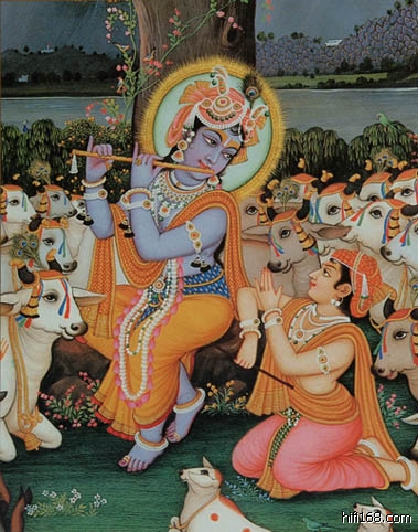 奉爱瑜伽的灵性冥想图中总是能看到瑜伽之主 Krishna 吹奏笛子 吸引了许多牧牛姑娘前来倾听,这应该是最早的Bansuri(班苏里)独奏音乐会了.