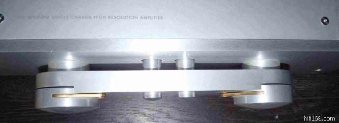 类功放,厚实的全铝本色躯体加上两边的散热片,显得很简练,最大的精秒之处是正面的四个圆形按钮。中间两个为电源与待机按钮,左右两边分别是输入选择档与音量调节,金色的三角设计非常华丽。而神弓