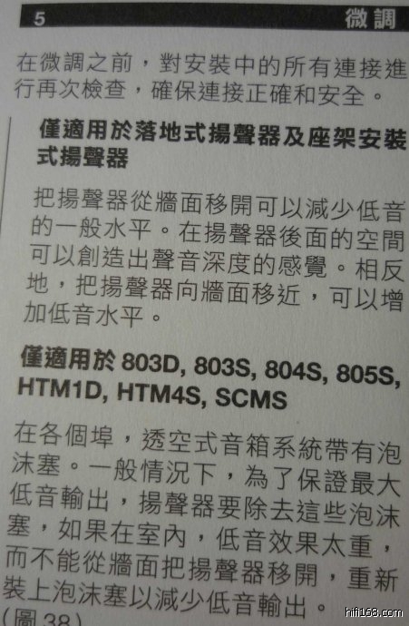 微调也很重要,说明书上写道:(见下图)喇叭从墙边拉开,可以减少低频,增加声音深度,相反,喇叭越近墙,低频越多。在使用805S时,如果觉得低频过多,可以装上海绵塞,堵住低音反射孔。