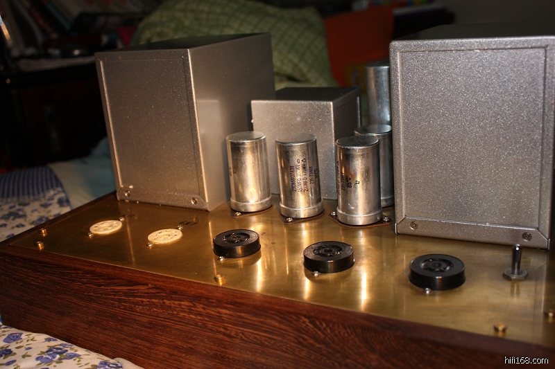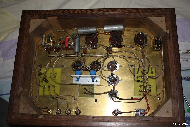 用料发烧,厚鸡翅木机壳,黄铜板面板,2毫米厚的不锈钢底板,西电管座,AB碳阻,西电及内线,猪嘴滤波电容,机内零件焊接及走线非常工整。光是用料就值回这个价了。