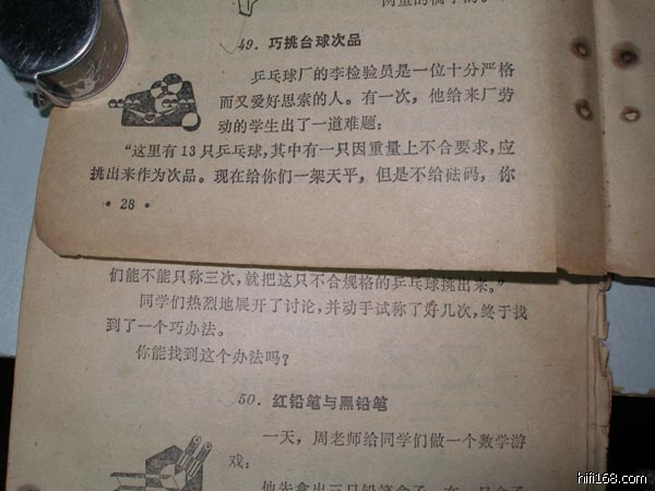 原帖由 kenzhong 于 2010-4-16 12:06:00 发表昨晚自己算了很久也搞不出来,今早问了读奥数5年级的小孩,两仔爷算了好久总算搞出来了:一开始把天平两边一边放4个,还有4个留着. 称呼不知是轻还是重的那个球为坏球。情况1:如果两边平了,那么坏的肯定是在留着的4个里面.把4个球编号为1,2,3,4. 先把1和2拿出来称,如果平了,那么就意味着坏的在3和4里面.那么由于1和2是完好的,于是就把1和3称一下,如果1和3是平的,那么就