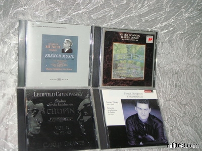 左上蒙许指挥的法国音乐包括拉威尔的西班牙狂想曲和几个其他的序曲,日版半银圈,RCA红印,全新,50;右上小克莱巴指挥的89年新年音乐会,日版,无IFPI,盘上较多的小点,播放完美,30;左下GODOWSKY根据肖邦练习曲研究而作的钢琴曲,美版NIMBUS压盘,无划痕,50;右下加拿大当代最杰出年轻小提琴家JAMES EHNES拉的法国作品,包括圣桑,肖松等作品,50.