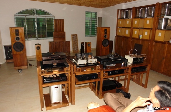 听感来了:环境刚立成不久,朋友是从店老板退居到发烧友的,身份改变了,但发烧的心一直都是火热!系统中大部分都是二手的器材,但是状态都是一级棒!单单是那对用一对C2的代价迎娶回来的喀吧斯老旗舰,就足以让人佩服其独到的眼光!中道的1000,是其颠峰时代的旗舰产物,二手的代价也惊人,在多款老旗舰的连手出力下,此系统重播出了非常宽松大气的声音,而且在宽松的前提下不失透明度,这是物主所追求的声音风格,当时众人一直要求播放李娜的LP,那高耸人云的高频却一点都不压迫耳膜,也许,这并不是太多系统能做到!而且高级LP机的那种绵长的韵味,能在CD系统里几回闻?众人陶醉之余,才察觉到因为环境巨大的关系,功放的推动力(西电300B单端)稍嫌不足而已.....