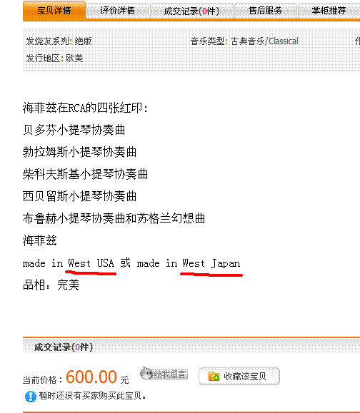绝版:海菲兹:RCA红印四张:RCA 品相完美600元
