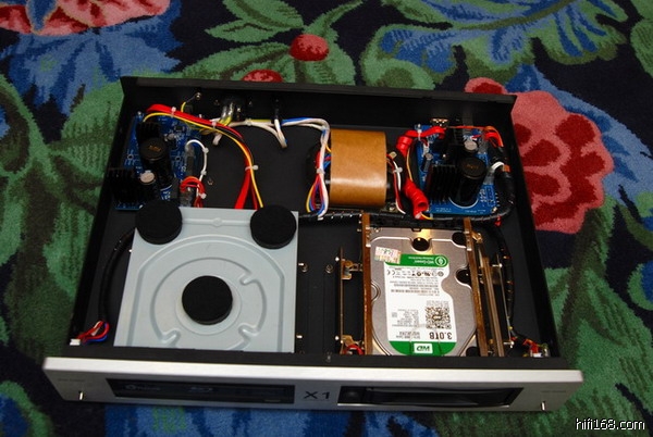 如今,期待已久的X1终于到手了!收货后第一时间打开机壳看个究竟,一看内部结构非常工整,供电及信号输出线路板是光驱与硬盘各用一块的,而且是各装一角减少了相互之间的干扰;在光驱的顶部、底部贴上了黑色的消震物料,使之声音背景更干净、顺滑;光驱及硬盘架的固定支架非常扎实,硬盘架也比我台式机用的抽屉要顺畅多了,值得一赞!好得当初没有自制线性电源的盒子,哪怕退一步只做分体供电的盒子也超出了当初构思的预算,光驱用回lT的盒子远远不及X1扎实、美观,如要效仿它弄好避震就没可弄的空间了。