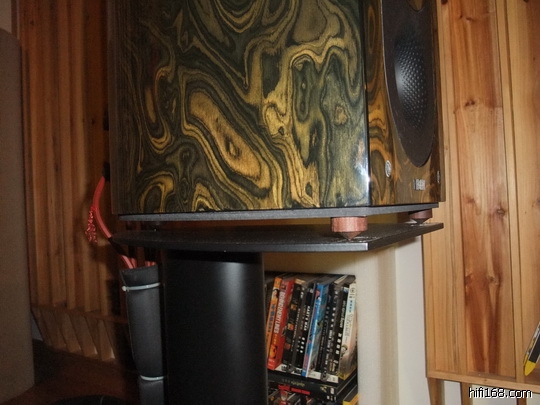 这音箱底下的化震钉。“B&W音箱的低频不容易搞得好声”,相信许多同好都会这样认为,我在实际使用过程中亦发现这个问题,但,并不是象个别同好说的那样“浑然一片”这么差,我调试的过程中曾用过水晶钉、黑檀钉、磁铁钉、石墨钉、老紫檀钉,最后发现图上的这几只老紫檀钉声效最好,最明显的是它有效的改变了低频的声音密度和结象力。