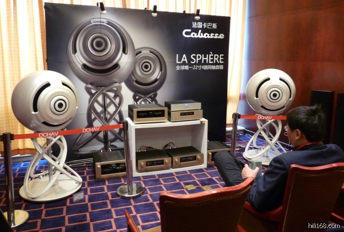 这次,非常荣幸地听到了法国CABASSE 卡巴斯的旗舰La SphereLa Sphere,法语“圆球”的意思,非常形象地说明了音箱的造型。这,绝对是一件艺术品!硕大的珍珠白外壳圆球由巨大的底座撑起,之间环绕着美丽的光环,仿佛M78星云中翱翔的行星般夺人眼球。这对圆球每个重达100公斤!!!采用地球上最大的22寸同轴设计,使得频响范围达到20赫兹到25000赫兹!四路四单元设计,自带1000瓦有源低音炮。定价高达150万港元!