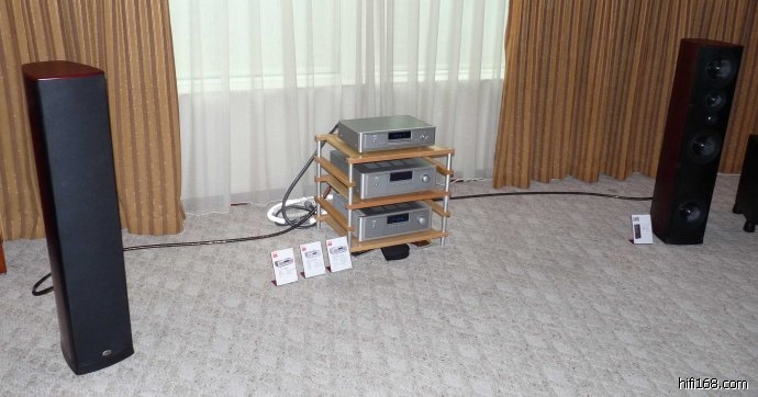 如果你以为展会上你听到的声音是以你看到的放在地上的卡玛功放驱动,那你就错了。真正驱动这对旗舰喇叭的,是世界最顶级的功放,瑞士的FM acoustics 的两台顶级立体声功放!分别驱动卡玛旗舰的中高音单元与低音单元!而接线全部为卡玛顶级线!