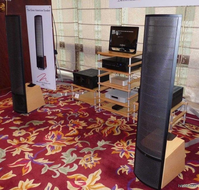 现场开声的是MARTIN LOGAN ESL系列的老二,定价九万多元的Summit(中文翻译为顶点)静电动圈混合喇叭,(旗舰为纯静电喇叭25周年纪念型号CLX),从正面看,有一只10寸低音单元,其实,有两只!还有一只隐藏在箱底下,朝向地面!负责驱动低音单元的是随箱附带的2×200W(4 ohms)的低音用功放。密闭式的低音箱体设计重在强调干净的低频质感,低音下潜可达24赫兹。