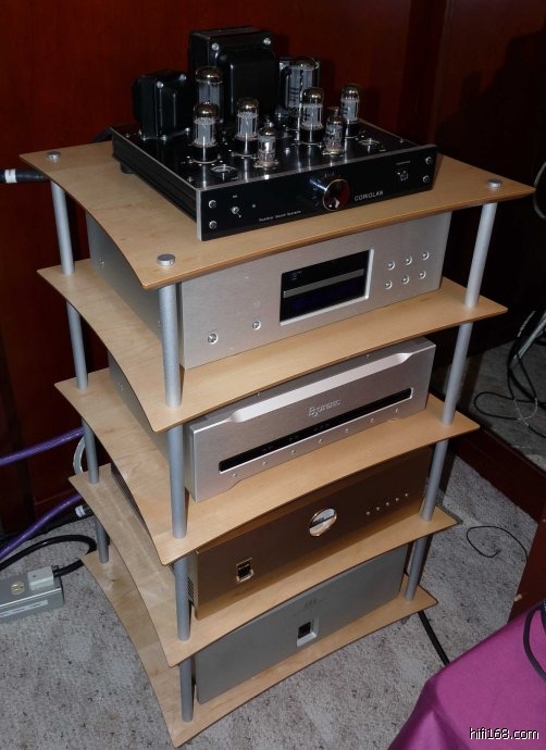 五层器材架上,有硬总提供的超重量级音源系统ESOTERIC X01D2G0RB时钟,金嗓子PS510电源处理器,CSE电源处理器,007耳机以及驱动007耳机的意大利超弩级静电耳放CORIOLAN。这套系统足够强大,令我的一个朋友听得大呼007太强大。但是,我还是感到有些遗憾,因为, 瓶颈在于CORIOLAN耳放全部的电子管都为俄罗斯EH制品。声底也有一层俄罗斯EH管典型的闷与略散的声底。玩电子管机器就是玩胆这句话一点也没错,没有优秀的电子管的配合,胆机的整体实力将大打折扣。我想,硬总自己用KRELL前级搭配717/727