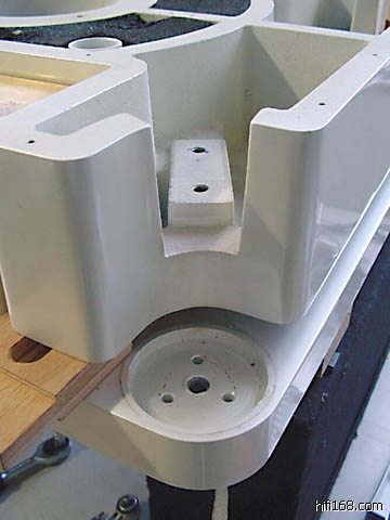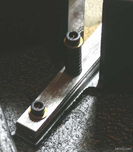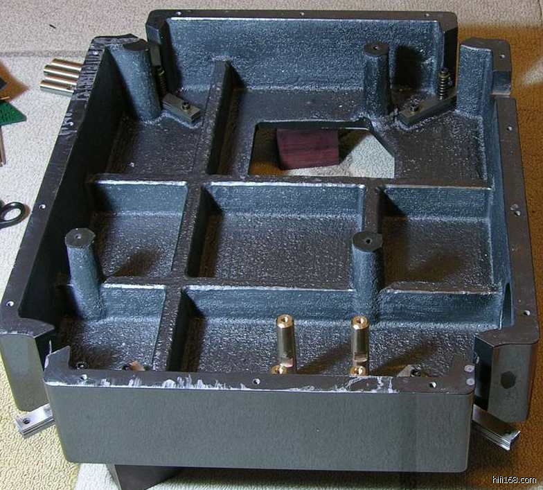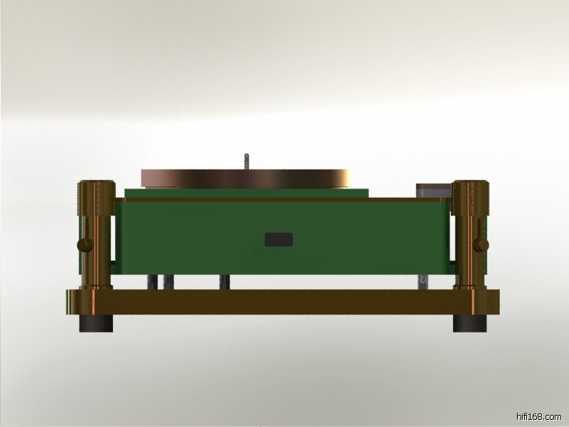 所以,在下设计401的底座是也采取了同样的原则:大重量、低重心、钢板弹簧悬挂,而将被发烧友诟病最多的401的“体积、噪声巨大的”电动机从其面板上分离、通过3个立柱固定在作为基座的底板上。其间得到了luss兄宝贵的THORENS的REFRENCE的拆解资料图片和Richard老弟宝贵的建议。