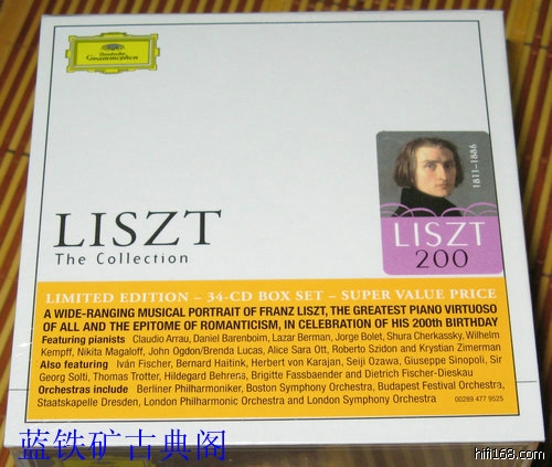 [align=center][b][size=6]李斯特诞辰200周年纪念[/size][/b][/align][align=center][size=5][b]2011年是作曲家李斯特诞辰200岁的周年纪念[/b][/size][/align][align=center][size=5][b]DG公司推出这个目前最好,最实惠的收藏家套装。[/b][/size][/align][align=center][size=5][b]内容分为6个种类,包含了Liszt各类型的作品, [/b][/size][/align][align=center][size=5][b]全部都由最好的指挥家和演奏家演绎。[/b][/size][/align]