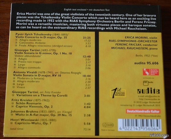 上周,购得一张ERICA MORINI的碟,主要是冲着她在1952年柏林现场录音的柴小协去买的。这位女小提琴家出的碟很少,我是上HIFI168在某些旧贴讨论四大小协或著名小提琴家的贴子时,偶尔有专业人士推荐她的名字和唱片,并加以强调她的演奏非常好,这才在脑海里记住了“莫里妮”的名字。