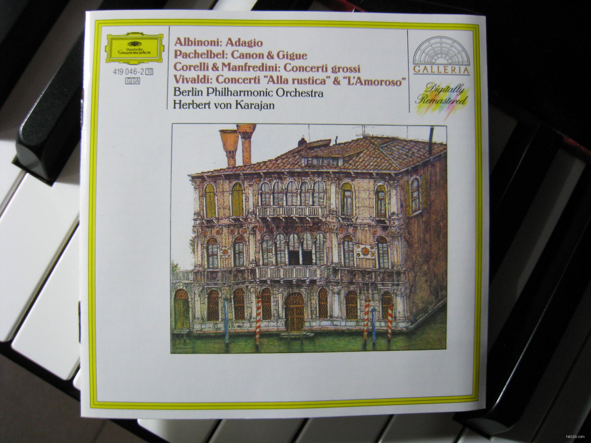 Karajan70年代时在DG很罕有的录了一张巴洛克的音乐集,里面都是耳熟能详或者旋律优美的作品:Albinoni的《g小调柔板》、Corelli的大协奏曲、Vivaldi的两首协奏曲,Pachelbel的《卡农与吉格舞曲》和Manfredini的大协奏曲。乐团是Karajan的亲兵柏林爱乐。