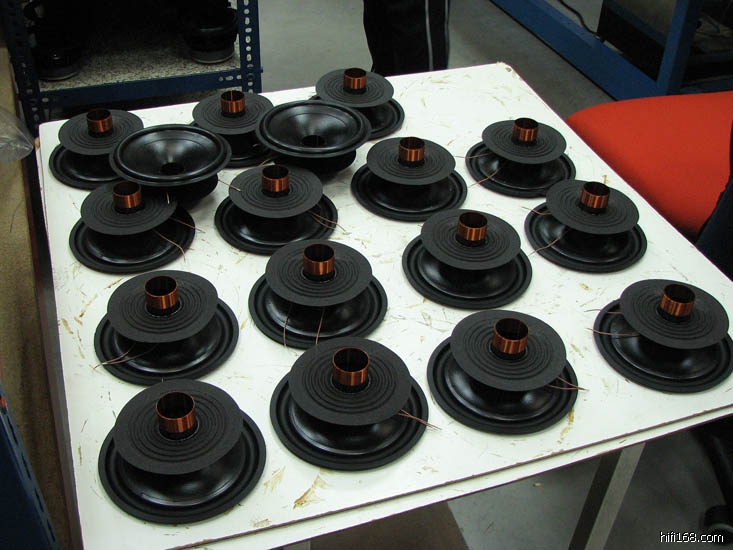大量的音箱箱体摆放在一起,等待装配单元。不知大家发现没有,樱桃木的箱体很受发烧友的欢迎,工厂内基本上都是樱桃木的箱体。
