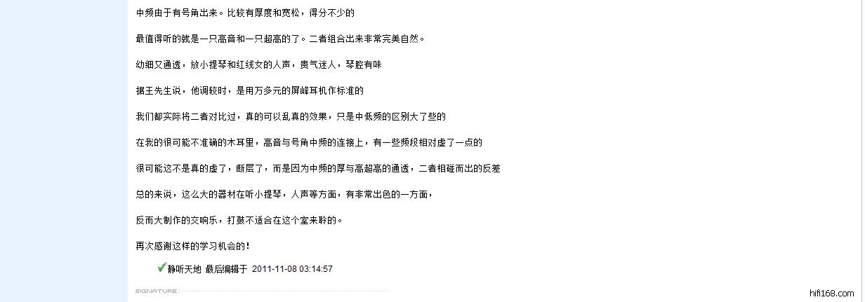 可以说,每一个人对音响的爱好、认知和听感都不同!有时候还会存在相当大的差异!……这也是很正常的事情!但是!想不到静听天地(凌生)你在场听音响的时候并无直接当面提出(说出)你自己个人的“解见”以及感受!……反而是在背后“搞小动作”!在HI FI168论坛上发表了以上的一大篇子虚乌有、歪曲事实的“言论”!……到底静听天地(凌生)你真正动机与目的何在?……你是喜欢这样干的?……请大家评评理!……
