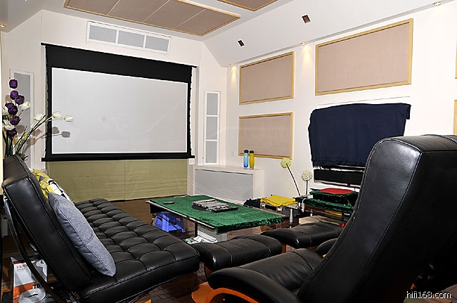 赖英智主编最近换了一套最新的音响,而且是他自己参与设计、改造的。上几个星期,赖英智主编邀请了willson版主、邝医生和我一起,参观和试听了这套新器材。其实这是一套7.2声道的多声道音响系统,投影幕左右就是入墙的主扬声器。