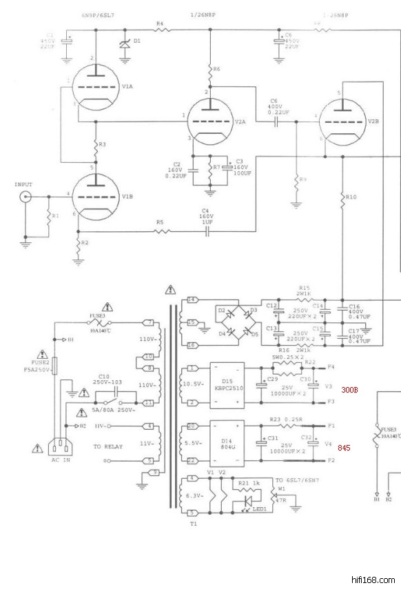 电路图上是找着了,6sl7、6sn7的250v 220u不用动?而且这里为什么要弄耐压这么高的?这里电压很低的,而且300B、845灯丝滤波电容耐压也才25v,不明白为什么这么设计。