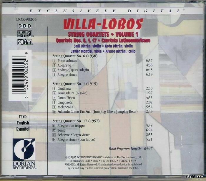 维拉-罗伯士共写了 17 首絃乐四重奏,写作的时间跨越了 42 个年头,就我手边已经买到的两张五首(第 1 号、6 号、7 号、15 号和 17 号)而言,无论是乐器间之对话、音色构成、旋律、节奏、或现代与传统间以及在地与异国音乐元素之间的頡頏,拉美四重奏团(Cuarteto Latinoamericano)的演出都足以让人陷入激情与沉思之最。在 Astor Piazolla 的 Tango 之外,我想 Villa-Lobos 这些絃乐四重奏该是南美音乐最得丰美的宝藏之一,就像亚马逊雨林一样,唯一不同的是,这音乐绝对值得深入开发,它也不会被人类破坏或被歷史淘汰。