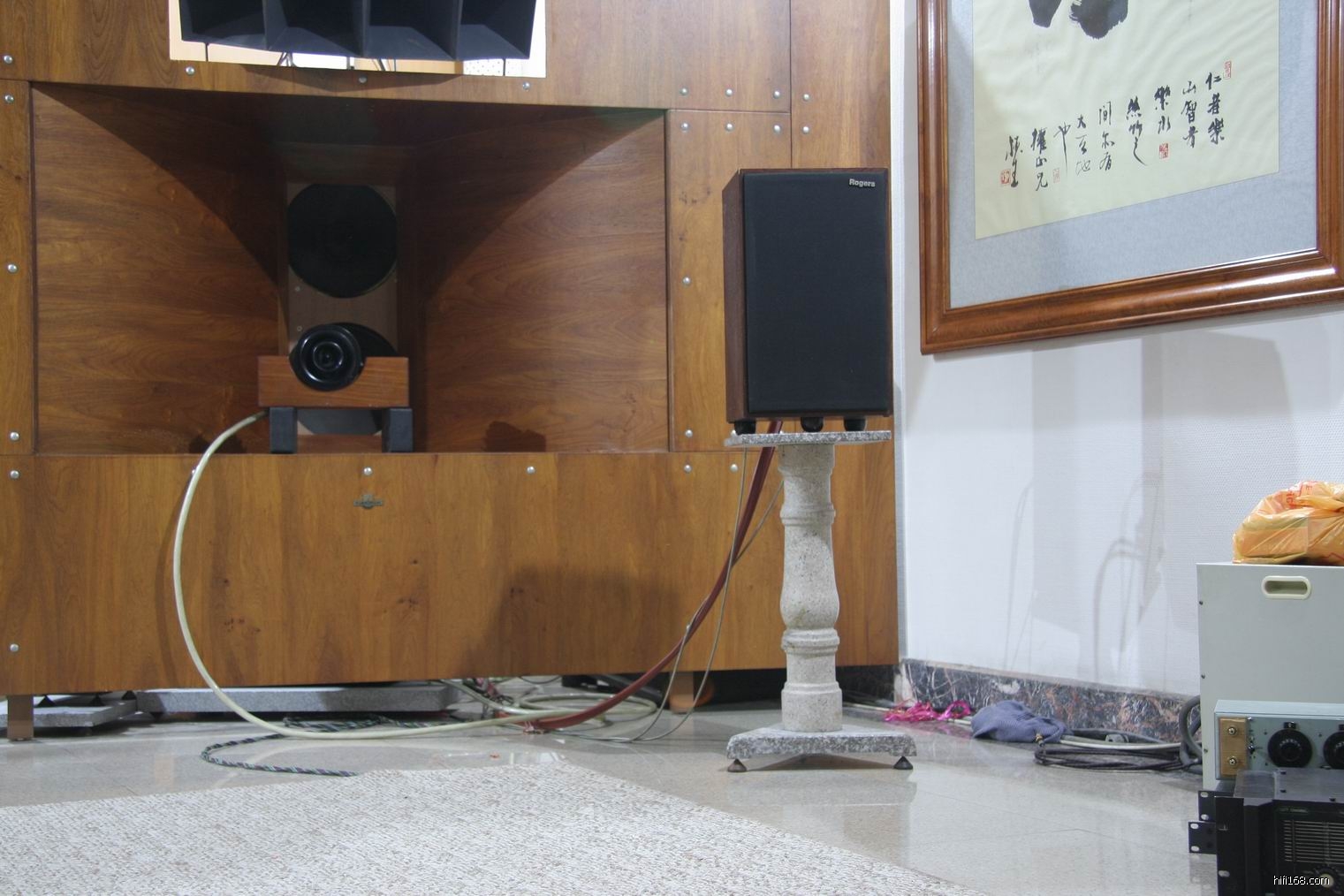 英国Roger(乐爵士) LS5/9两路书架箱在巨型障板面前显得很渺小了。
