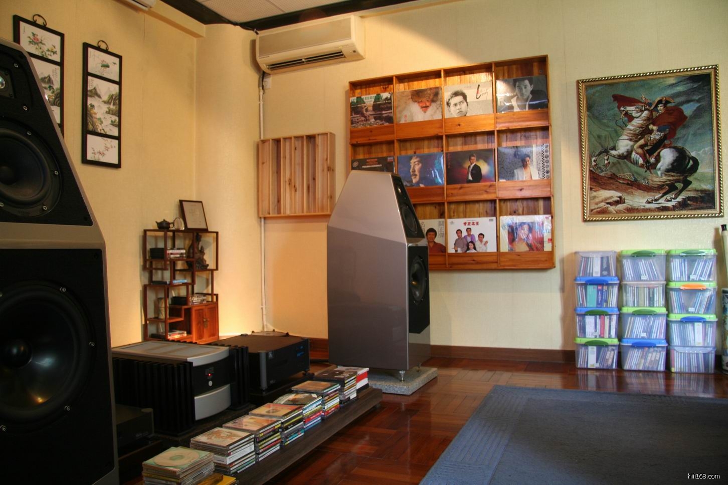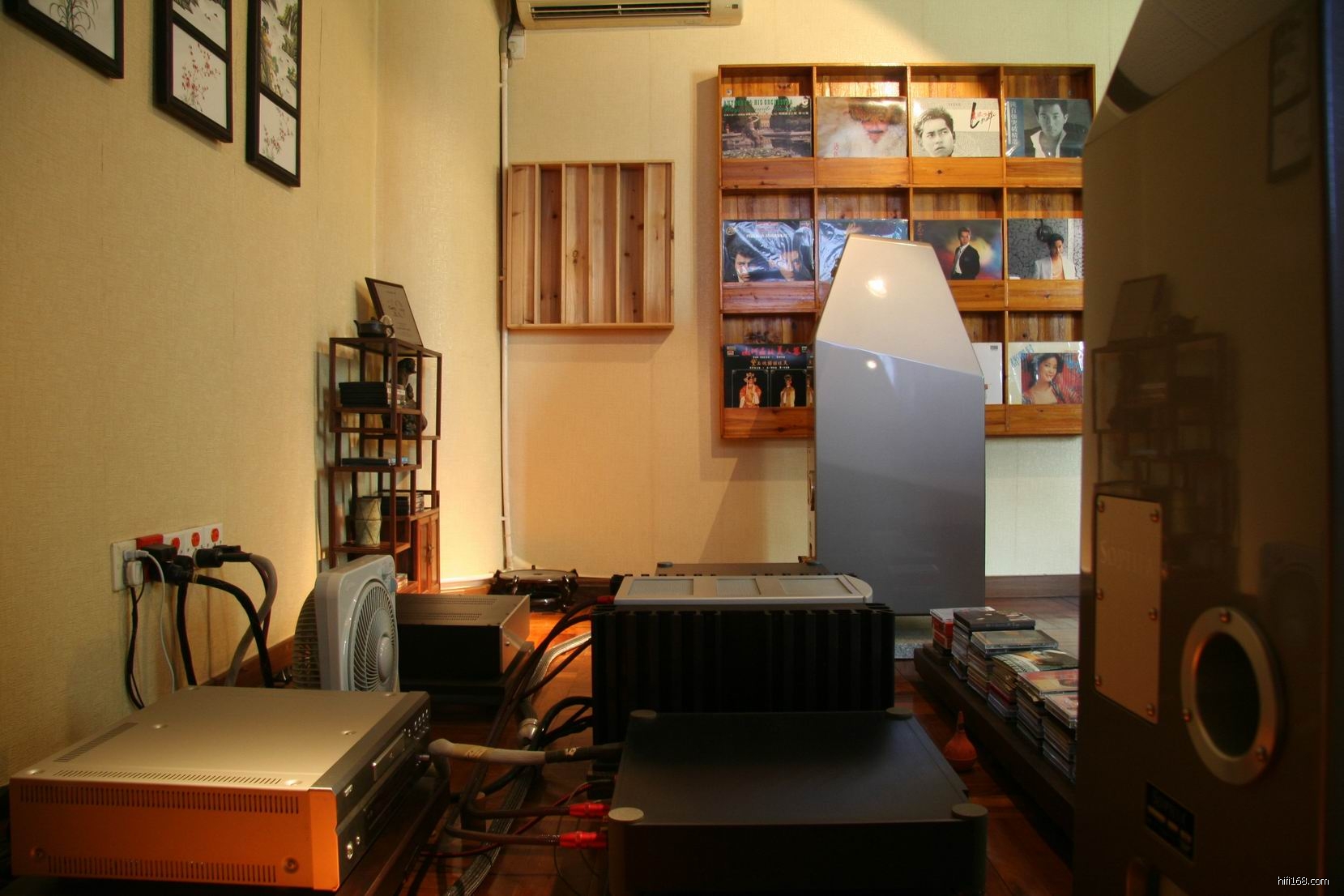 黄生的听音室大概是25平方米左右,设在二楼。器材由:Wadia 270 CD转盘,Wadia 27 CD解码器,MarK Levinson No.336 双声道晶体管后级,Wilson(威信) Sophia 十寸低音三单元落地箱 所组成。声音表现出耐听、自然、活生感不错,简单的乐章令人有百听不厌。有烧友会问:为何黄生没有使用前级?没错,黄生没有加入前级使用,现在只用Wadia 27 CD解码器控制音量直接推动 No.336后级,所以在大型乐章播放时感觉有力不从心,控制不好的现象。其实黄生很早已清注意到这点,不使用前级是等现在这套系统稳定下来,看看那方面要改进后才增加一个高质素的前级,从而一击即中,减少不必要的付出,确实一个很好的办法。