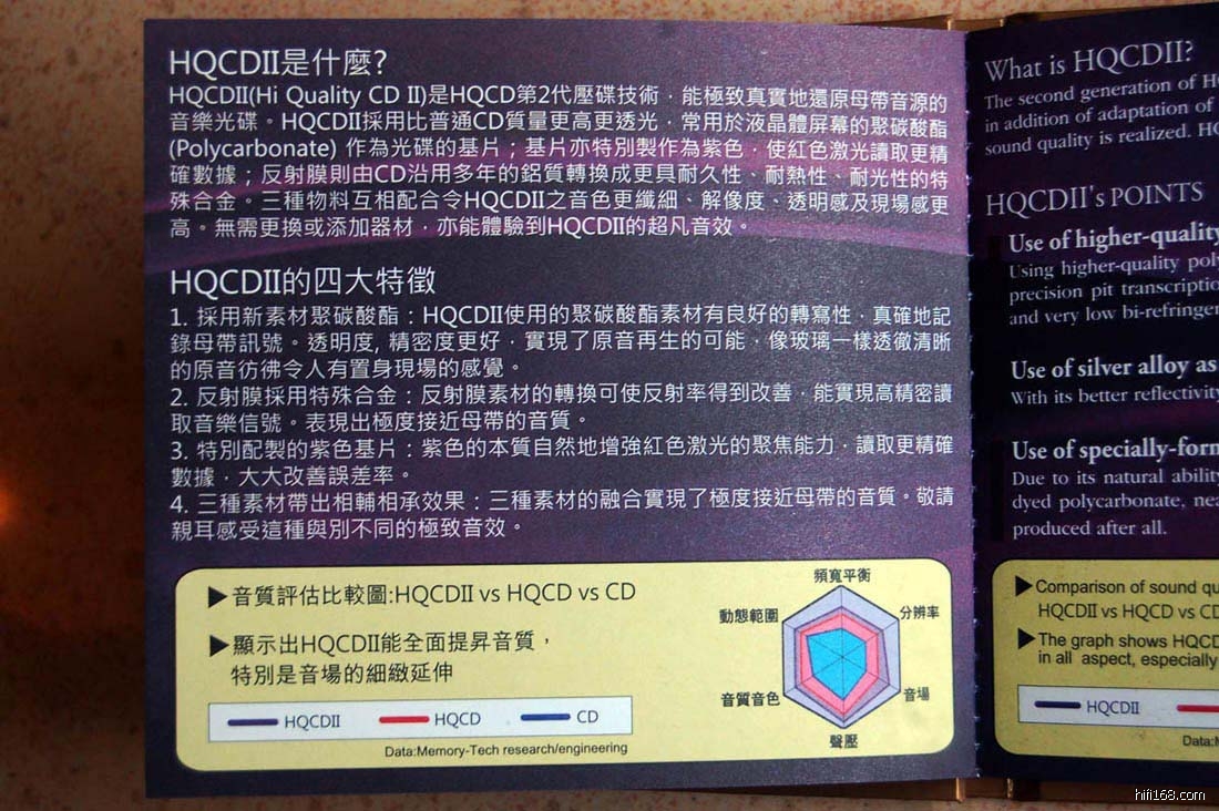 HQCDII??这张HQCD二代的碟子应该是第一张HQCDII,碟信号面变成了和AQCD一样的紫色,怎么成了AQCD?一看册页说明,原来是第二代的HQCD是与香港AQCD、上海联合光盘厂一起合作的(具体看照片里的说明)。